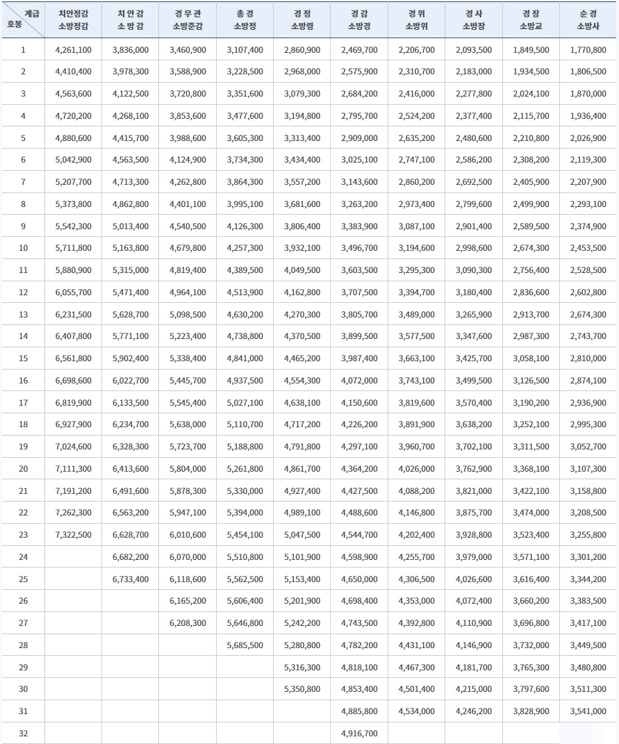 가장 적은 월급을 받는 소방사 1호봉의 경우 1,770,800을 수령하게 되고 가장 많은 월급은 소방정감 23호봉으로 7,322,500의 월급을 수령하게 됩니다.