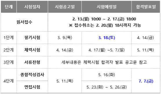 소방공무원은 크게 4단계의 시험 절차가 있습니다. 1단계는 필기시험, 2단계는 체력시험, 3단계는 서류전형, 4단계를 종합적성검사와 면접시험으로 나뉩니다. 매년 말에 다음 연도의 채용시험 일정이 공고되며 시험은 상반기 중으로 진행됩니다.