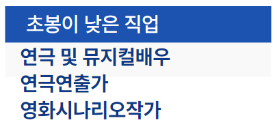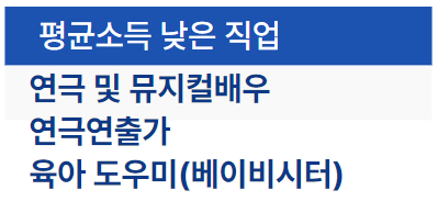 평균연봉이 가장 낮은 연봉은 연극 및 뮤지컬배우로 1,474만원을 받았습니다. 그다음으로 연봉이 낮은 직업은 연극연출가 1,860만 원, 육아 도우미(베이비시터) 1,902만 원으로 조사됐습니다. 평균소득이 낮은 직업 상위권은 예술과 관련된 직업이 다수 포함되었습니다.