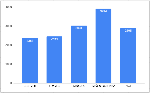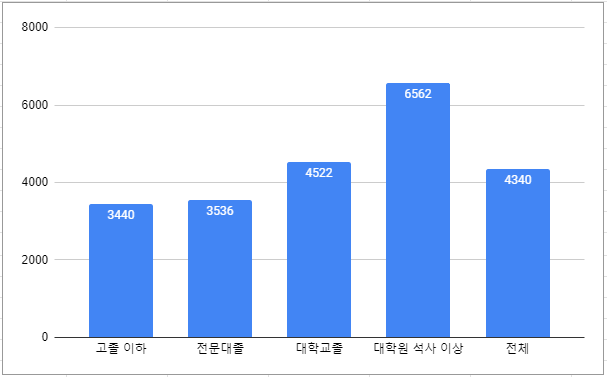 학력별 평균연봉은 대학원 이상이 6,562 만원으로 가장 높은 연봉을 받았습니다. 그 다음으로는 대학교졸이 4,522만 원, 전문대졸이 3,536만 원, 고졸 이하가 3,440만 원을 받았습니다. 고졸이하와 전문대졸의 차이는 크지 않았고 대학교졸부터 연봉이 크게 상승했습니다. 그리고 대학원 석사 이상인 경우 대학교졸보다도 40% 이상 높은 연봉을 받았습니다.