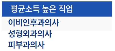 평균소득이 높은 상위 직업 10개 중 9개 직업이 의사로 조사됐습니다. 평균 연봉이 가장 높은 직업은 이비인후과의사로 13,934만원으로 조사됐습니다. 그다음으로는 성형외과의사가 13,230만 원, 피부과의사가 13,043만 원의 연봉을 받았습니다. 상위 10개 직업 중 유일하게 의사가 아닌 직업은 기업 고위임원이며, 의사와 기업 고위임원을 제외하면 가장 높은 연봉은 항공기조종사로 조사됐습니다.