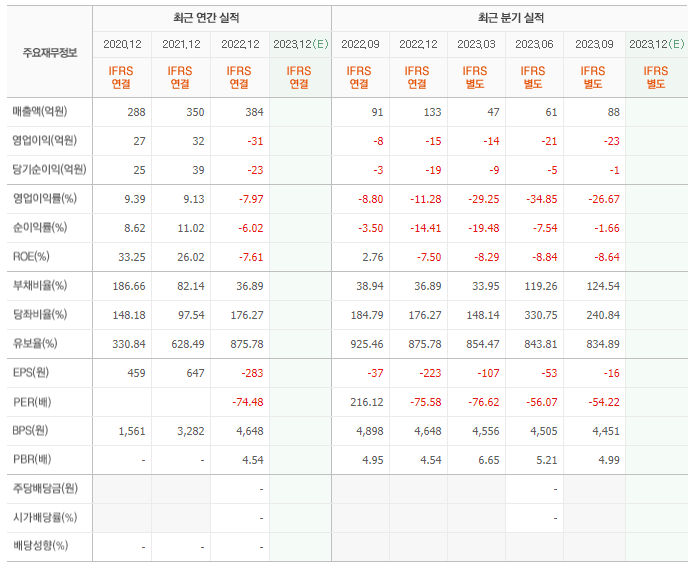 2022년 매출은 384억, 영업이익은 -31억, 당기순이익은 -23억입니다. 그리고 영업이익률은 -7.97%입니다.
