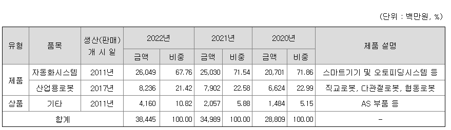 협동로봇은 협업형 현장 작업 지원 로봇으로 최근 카페, 음식점 등 F&B시장에서 큰 두각을 나타내고 있으며 당사의 해당 사업군의 로봇으로는 EC63, EC66, EC612 등이 대표적입니다. 두번째 자동화시스템의 대표 제품 라인으로는 온조기 등을 활용한 자동원료공급장치인 오토피딩(Auto-Feeding)시스템과 냉각시스템이 있으며 공장 자동화에 필요한 스마트 팩토리 솔루션(Link-Factory 4.0)을 생산 판매하고 있습니다.