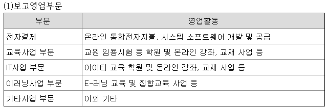 당사는 전자지불결제대행업(Payment Gateway)을 영위하고 있습니다. 신용카드사와 가맹점사이 및 통신사와 가맹점사이 대표가맹점으로 약 27,500개 가맹점을 연결하여 결제서비스를 제공하고 있습니다. 당사는 전자결제시장에 안주하지 않고 새로운 사업을 지속적으로 추진하고 있습니다