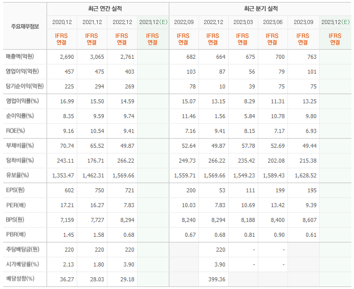 2022년 매출은 2761억, 영업이익은 403억, 당기순이익은 269억입니다. 그리고 영업이익률은 14.59%입니다.