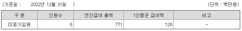 미등기임원의 평균연봉은 1억 2800만원이고 직원수는 6명입니다.