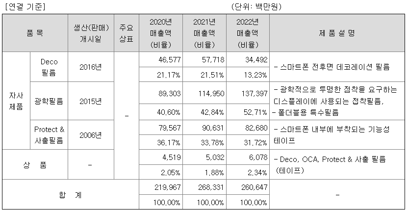 당사가 생산하는 필름 제품의 경우 소재, 부품으로 들어가는 제품으로 상표가 존재하지 않습니다.