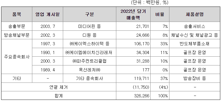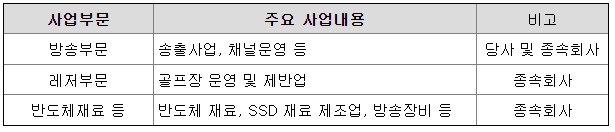 당사와 그 종속회사는 방송부문, 레저부문, 반도체재료 부문의 총 3개 사업부 체제로 운영되고 있으며, 각 사업부문별 주요 내용은 다음과 같습니다.