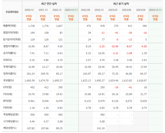 2022년 매출은 1827억, 영업이익은 83억, 당기순이익은 121억입니다. 그리고 영업이익률은 4.55%입니다.