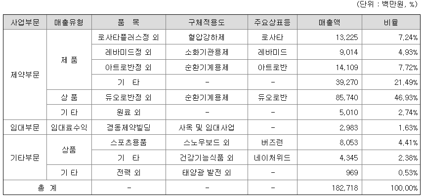 사업부문은 제약부문과 임대부문, 기타부문으로 구성되어 있습니다. 국내 매출은 병의원 및 제약회사로의 직접 판매 또는 의약품 도매상을 통한 판매가 이루어지고 있으며 국외 매출은 의약품종합상사를 통해 판매가 이루어지고 있습니다.
