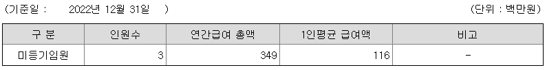 미등기임원의 평균연봉은 1억 1600만원이고 직원수는 3명입니다.