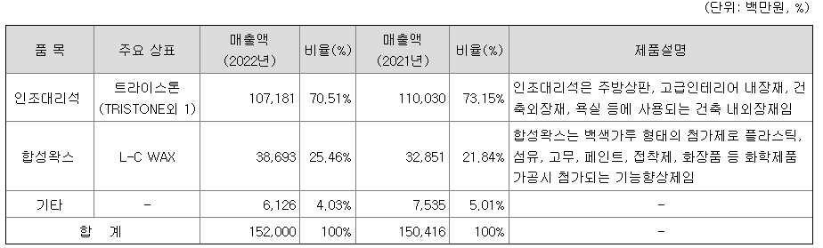 당사는 건축 내외장재로 사용되는 인조대리석 및 플라스틱의 물성 개선을 위해 첨가되는 합성왁스를 생산하고 있습니다.