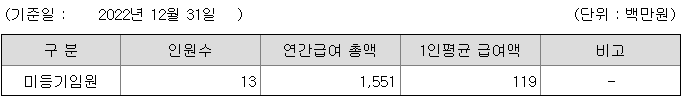 미등기임원의 평균연봉은 1억 1900만원이고 직원수는 13명입니다.
