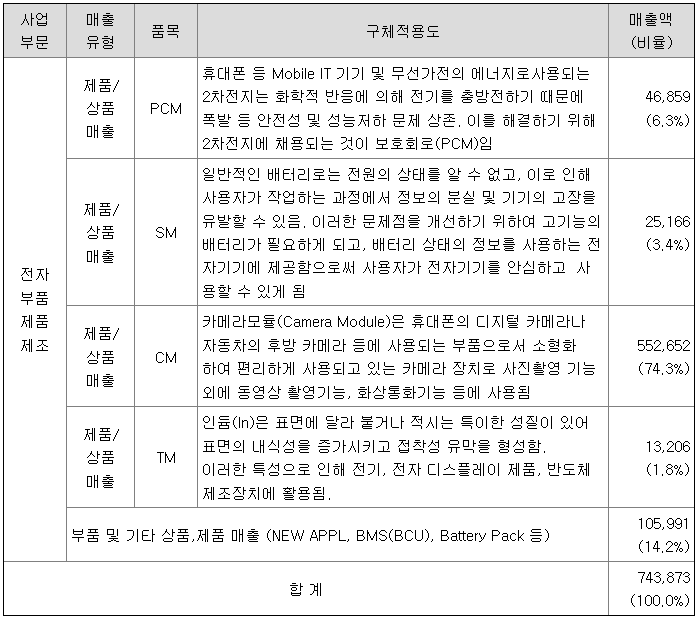 당사는 2차전지 보호회로 및 중대형 배터리팩을 제조하는 ES(Energy Solution) 사업부문과 IT Mobile 및 전장용 카메라모듈을 제조하는 CM(Camera Module) 사업부문을 주요 사업으로 영위하고 있습니다.
