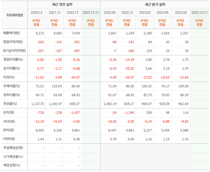 2022년 매출은 7439억, 영업이익은 -391억, 당기순이익은 -497억입니다. 그리고 영업이익률은 -5.26%입니다.