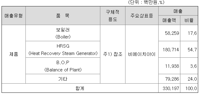 발전용 기자재는 주기기와 보조기기(Balance of Plant)로 나뉘어지는데, 열을 발생시키는 연료에 따라 발전형태와 주기기가 정해지며, 보조기기류는 발전형태와 상관없이 공통적으로 적용이 되고 있습니다. 주기기는 원자로(원자력), 보일러(화력), 가스터빈·HRSG(복합화력)등으로 나뉘며, 그에 따른 보조기기류는 크게 복수기, 급수가열기, CCW 쿨러, 탈기기 등이 있습니다. 이 중 당사가 생산하는 발전설비는 주기기인 각종 보일러(Boiler)류 및 배열회수보일러(HRSG), 보조기기인 복수기(Condenser), 열교환기(Heat Exchanger), 탈기기(Deaerator)등이 있습니다.