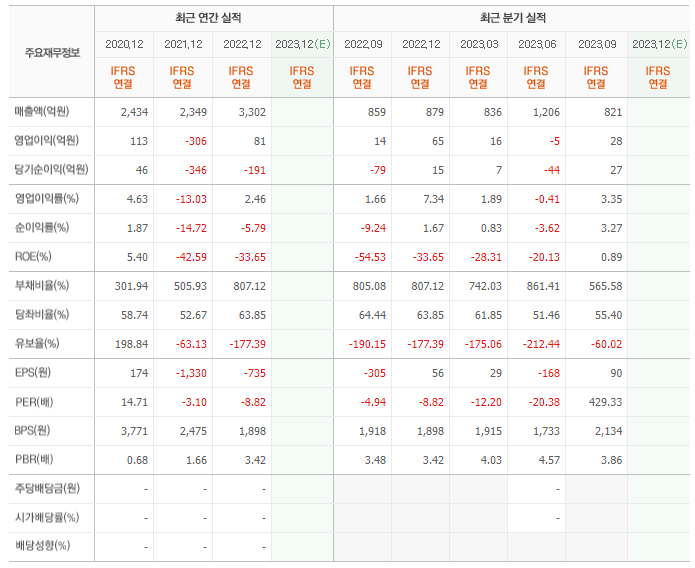 2022년 매출은 3302억, 영업이익은 81억, 당기순이익은 -191억입니다. 그리고 영업이익률은 2.46%입니다.