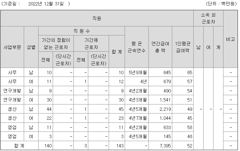 전체 평균연봉은 5200만원이고 직원수는 143명입니다.