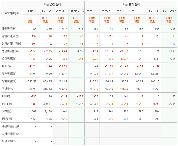 2022년 매출은 412억, 영업이익은 -160억, 당기순이익은 -72억입니다. 그리고 영업이익률은 -38.94%입니다.
