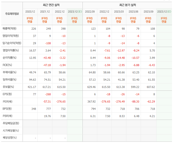 2022년 매출은 398억, 영업이익은 -10억, 당기순이익은 -13억입니다. 그리고 영업이익률은 -2.41%입니다.
