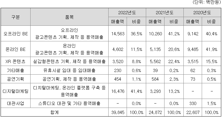 당사는 2006년 7월에 설립하여 ‘브랜드 익스피리언스’(이하 "Brand Experience”, "BE” 또는 "브랜드 경험”) 광고콘텐츠의 기획 및 제작 솔루션에 특화된 기업입니다. 브랜드 경험은 기업의 신제품 및 서비스를 직·간접적으로 체험함으로써 소비자 스스로 적합한 제품과 서비스를 선별할 수 있도록 도와주고, 궁극적으로 구매 의사결정과 브랜드 로열티에 영향을 주는 핵심 요소입니다. 이러한 ‘고객 체험’을 기반으로 당사는 오프라인 Brand Experience 광고부터 OTT 플랫폼을 통한 온라인 영상 콘텐츠 제작 및 송출, 그리고 XR 기반의 실감형 콘텐츠를 제작하는 크리에이티브 콘텐츠 기업으로서 성장하고 있습니다.
