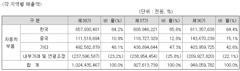 연결회사는 자동차용 DOOR MOVING SYSTEM을 전문 제조하는 업체로서 주력 제품인 DOOR MODULE, LATCH, HINGE, STRIKER 등을 생산하며 각 지역별 매출액과 각 품목별 매출액이 차지하는 비율은 아래와 같습니다.