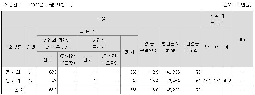 남성의 평균연봉은 7000만원이고 직원수는 636명, 여성은 6100만원이고 직원수는 47명입니다. 전체 평균연봉은 7000만원이고 직원수는 683명입니다.