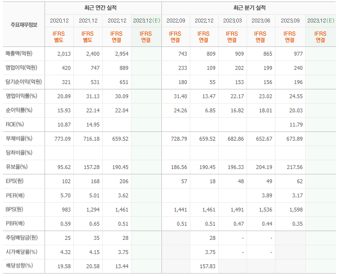 2022년 매출은 2954억, 영업이익은 889억, 당기순이익은 651억입니다. 그리고 영업이익률은 30.09%입니다.