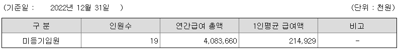미등기임원의 평균연봉은 2억 1492만원이고 직원수는 19명입니다.