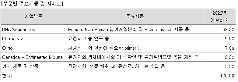 특히, 유전체 분석 서비스는 당사의 주력 서비스로써 사람부터 동물, 식물, 바이러스, 박테리아까지 다양한 생물 종의 유전자 염기서열을 분석해 그 결과를 제공하는 서비스로 1세대 유전자분석 기술을 이용하는 CES(Capillary Electrophoresis Sequencing)와 한 개체의 염기서열 전체를 해독하여 대용량 분석이 가능한 차세대 유전체분석 기술인 NGS(Next Generation Sequencing) 두 분야로 나누어 사업을 운영하고 있습니다.