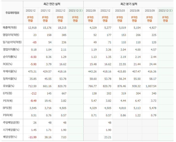2022년 매출은 1조 8215억, 영업이익은 385억, 당기순이익은 236억입니다. 그리고 영업이익률은 2.11%입니다.