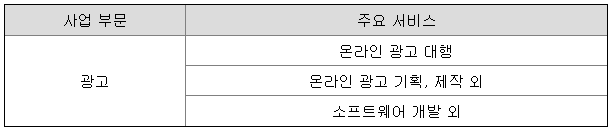 당사는 RTB 매체 (페이스북, 구글 등)를 기반으로 온라인 광고 대행, 모바일 광고의 기획, 공급효과분석 및 관련 소프트웨어 개발을 주요사업으로 영위하고 있습니다.