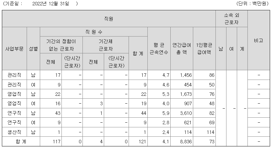 전체 평균연봉은 7300만원이고 직원수는 121명입니다.