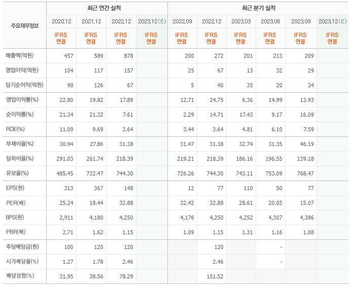 2022년 매출은 878억, 영업이익은 157억, 당기순이익은 67억입니다. 그리고 영업이익률은 17.89%입니다.
