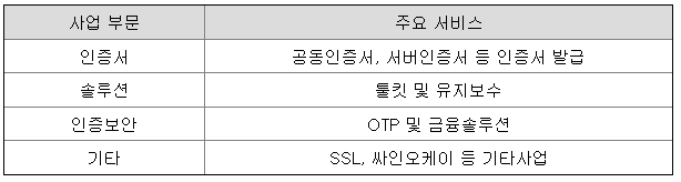 당사는 국 인증서의 발급, PKI 솔루션 개발 및 판매, SSL(웹보안서버) 판매, 바이오인증서비스, OTP(일회용비밀번호)제품 등을 영위하고 있습니다.