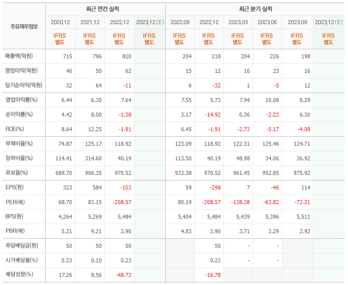 2022년 매출은 810억, 영업이익은 62억, 당기순이익은 -11억입니다. 그리고 영업이익률은 7.64%입니다.