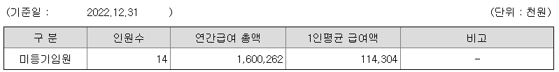 미등기임원의 평균연봉은 1억 1430만원이고 직원수는 14명입니다.