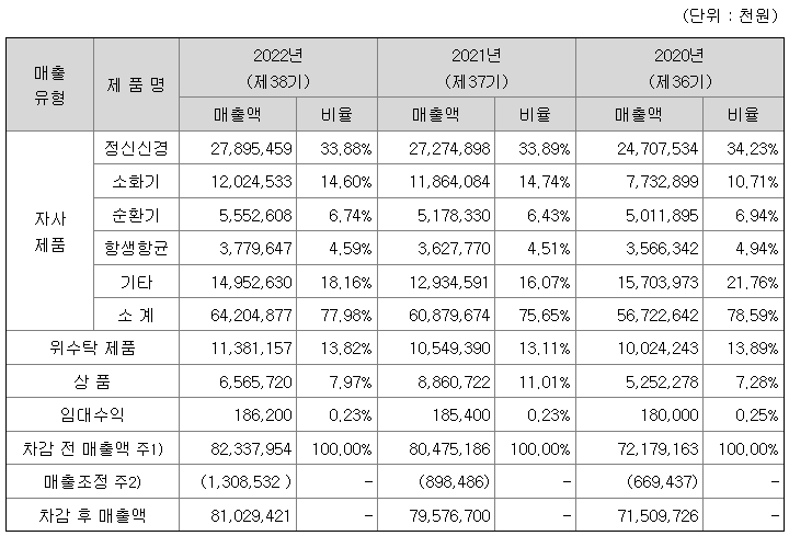 당사는 자체 R&D 개발을 통해 정신신경계, 소화기계, 순환기계, 항생항균 등 제조에강점이 있으며 내분비, 호흡기, 소염제, 당뇨병 등 다양한 질환군의 기타 처방 의약품을 제조 및 판매하고 있습니다