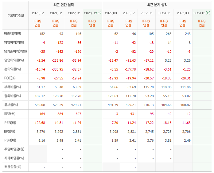 2022년 매출은 146억, 영업이익은 -86억, 당기순이익은 -120억입니다. 그리고 영업이익률은 -58.94%입니다.