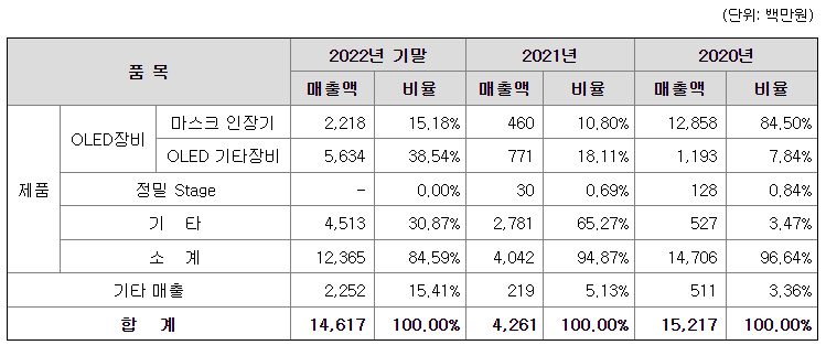 당사는 디스플레이 패널업체를 대상으로 정밀장비 제작 및 제어, 비젼기술을 바탕으로 OLED(Organic Light Emitting Diode) 디스플레이 공정에서 사용되는 장비를 개발, 공급하는 사업을 영위하고 있습니다.