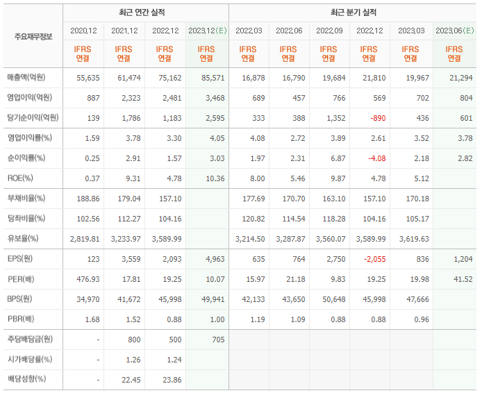 2022년 실적은 7조 5162억, 영업이익은 2481억입니다. 그리고 영업이익률은 3.30%입니다.