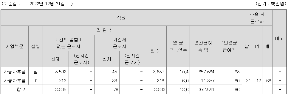 | 사업부문 | 성별 | 직원수 | 평균근속연수 | 평균연봉(백만) |