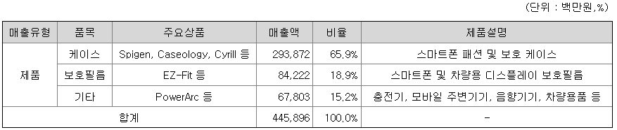 당사는 높은 온라인 세일즈 역량을 바탕으로 아마존(Amazon.com)이라는 글로벌 유통채널을 통해 스마트폰 액세서리 판매 사업을 영위하고 있습니다. 당사의 주요 제품은 스마트폰 케이스와 보호필름, 기타 모바일 액세서리이며, 제품별 매출 구성은 2022년 누적 기준 전체 4,459억원 중 케이스 2,939억원(65.9%), 보호필름 842억원(18.9%), 기타 모바일 액세서리 678억원(15.2%)입니다.