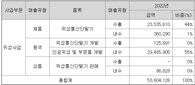 당사의 사업은 위성사업을 영위하고 있으며, 당사가 개발 생산하는 위성통신 단말기의 수요처는 대부분 해외시장이며, 인공위성 및 위성 부분품의 수요처는 국내 대기업과 정부 연구기관입니다. 주요 사업 내용은 아래와 같습니다.