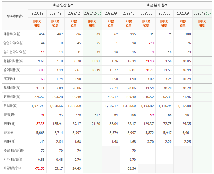2022년 매출은 536억, 영업이익은 45억, 당기순이익은 41억입니다. 그리고 영업이익률은 8.38%입니다.