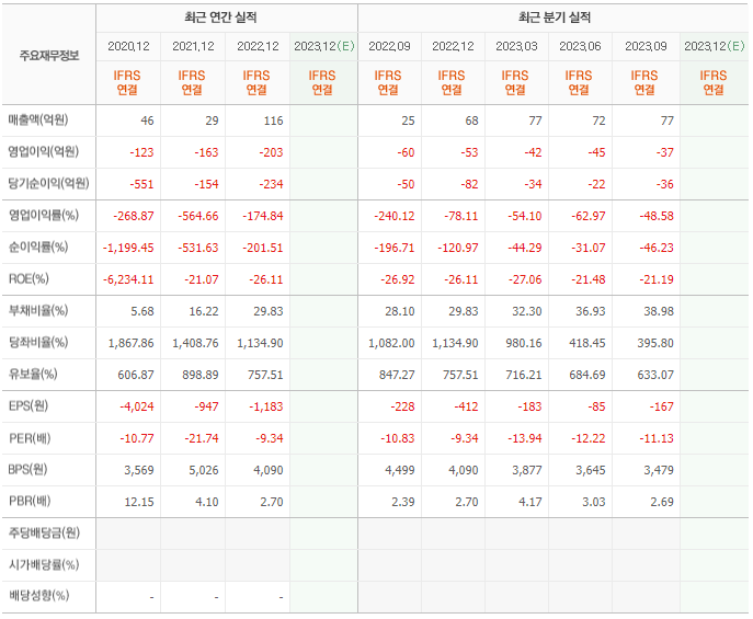 2022년 매출은 116억, 영업이익은 -203억, 당기순이익은 -234억입니다. 그리고 영업이익률은 -174.84%입니다.