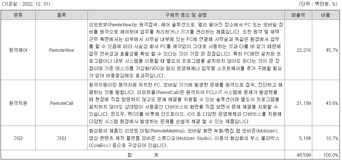 당사는 2001년 창사부터 현재까지 원격 소프트웨어를 연구, 개발, 공급하고 있습니다. 일본과 중국에 종속회사를 두고 있으며, 수출비중이 60% 이상인 글로벌 테크기업입니다. 국내외 통신사, 휴대폰/PC 제조사, 금융권, 정부/공공기관/교육기관, IT기업/일반제조업 회사 등의 기업 고객에게 주로 납품하고 있습니다. 지역별로는 일본향 수출 매출이 60% 이상이고, 판매방식으로는 물리적인 설비 구축이 필요없는 클라우드 서비스(Cloud Service) 방식이 매출의 70% 이상입니다.
