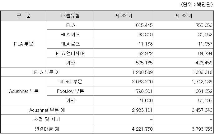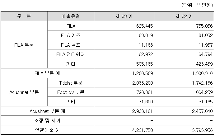 보고서 작성기준일 현재, 당사는 FILA 부문과 Acushnet 부문으로 사업부문을 구분하여, 각 사업부별 상품 현황을 기재하고 있습니다.