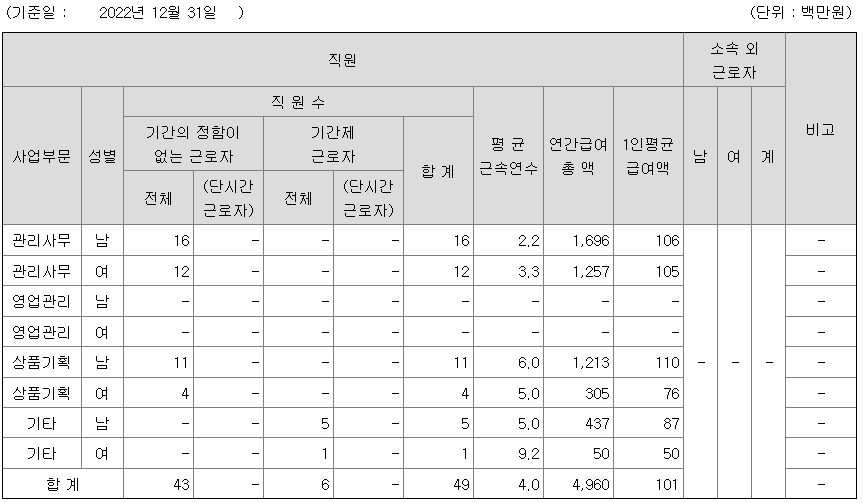 | 사업부문 | 성별 | 직원수 | 평균근속연수 | 평균연봉(백만) |