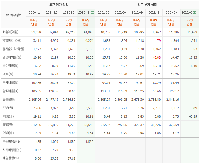 2022년 실적은 4조 2218억, 영업이익은 4351억입니다. 그리고 영업이익률은 10.30%입니다.